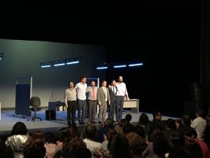 Pero desde luego el peso principal que sostiene el engranaje son los seis pedazos de actores que se suben al escenario. Empezando por un idealista Miki Esparbé, que de manera sobresaliente lleva un personaje con una evolución que sin duda es para quitarse el sombrero, o un Edu Soto con dos brillantes escenas (la relación con su mujer y el “duelo” que huele a “western” con Esparbé) donde navega entre la comedia, con diálogos que rozan el absurdo, y una violencia, casi sin sentido, defendiendo lo que es suyo. Y después, Secun de la Rosa, el empleado que aspira a un ascenso que nunca llega ofreciendo creo, la parte más tragicómica de la obra, un personaje que en principio nos puede dar pena, incluso sentirnos identificados, pero que al final peca de lo mismo que el resto. Manolo Solo, casi siempre acompañado de Edu Soto le da la réplica y usando la formula de la reiteración convierte las escenas en momentos lúcidos que el público aplaude. De Manuel Morón y Pepe Ocio eche en falta que aparecieran más en escena porque parece que tenían bastante que esconder (¿o no?). En el caso de Morón la escena con Esparbé es uno de los “momentazos” de la obra, y por otro lado esa llamada telefónica de Ocio al jefe nos llena de una inquietud desmesurada.
